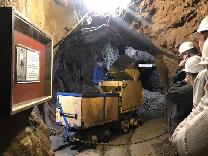 1 ODPOLEDNE Je to rozhodně skupina cestovatelů s kiwi všech věkových kategorií, kteří se připojují k Eddiemu na jeho odpoledním Gold Mine Tour, vyzdobení vestami s vysokou viditelností a ochrannými helmami. Ve srovnání s jinými mega-doly, jako je Super Pit v Západní Austrálii, počítá s tím, že Waihi’s Martha Mine je jen „butiková operace“, ale protože náš minibus proplétá pavoučí stezku kolem okraje dolu, počty, které Eddie odvíjí, jsou stále působivé. Od roku 1878 se důl vyvinul z voštiny na kopci, aby připomínal nebeský amfiteátr o rozměrech 1 km x 700 m. Zhruba 400 m níže jsou přepravní kontejnery zakrnělé kameny o velikosti čtyřpokojových domů, dědictví po skluzu, který důl uzavřel v roce 2015. Navzdory současnému uzavření Eddie potvrzuje, že v něm stále jsou „miliony dolarů stříbra a zlata“. důl a plánuje se budoucí znovuotevření.