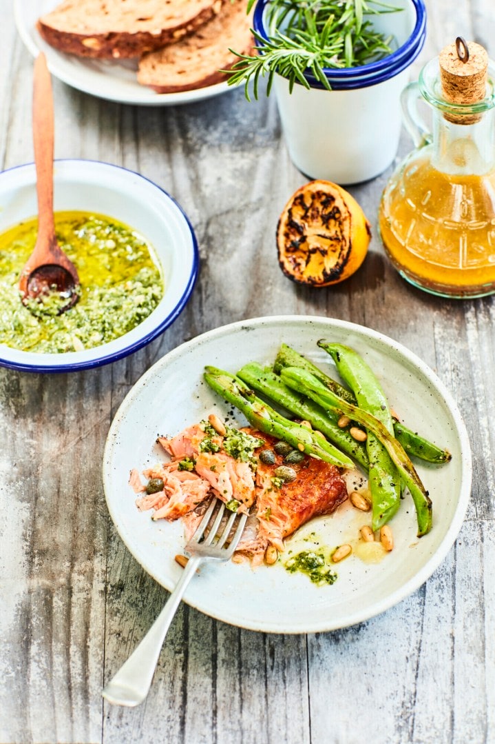 4 Lososa a fazole podávejte posypané piniovými oříšky a pokapané rozehřátou citronovou šťávou se zelenou omáčkou na boku. Mňam!