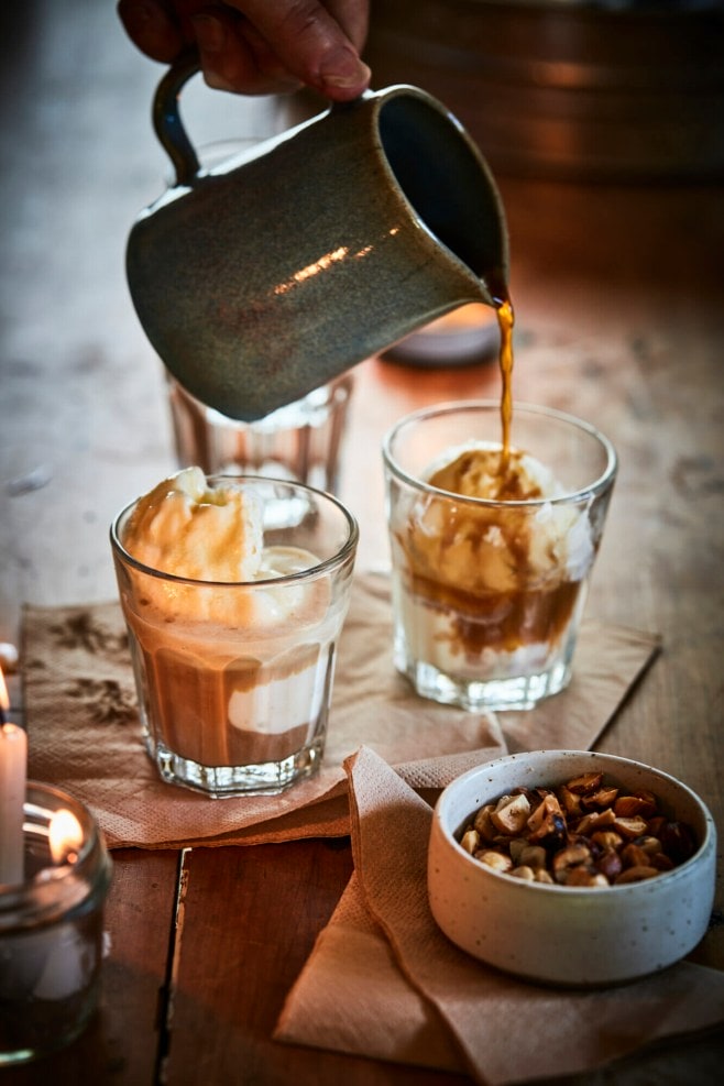 Toto je perfektní malá sladká lahůdka – vanilková zmrzlina utopená v kávě espresso a doplněná opraženými drcenými lískovými oříšky. Pokud máte chuť, přidejte panáka likéru. Bellissimo!