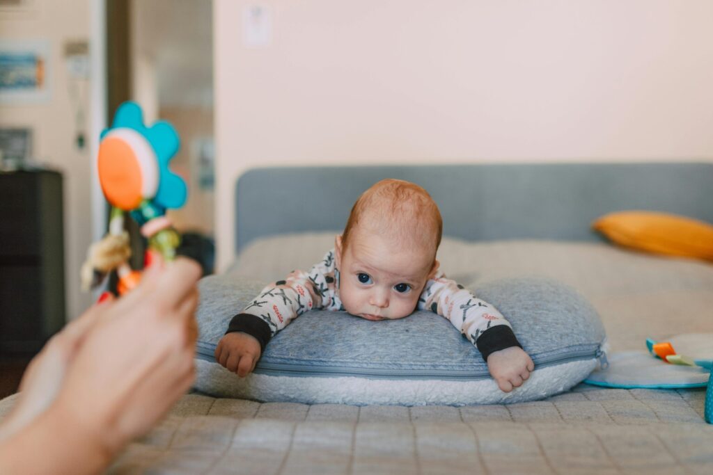 - Poskytněte ruční manipulaci a vedení pohybu. Během doby břicha povzbuďte své dítě, aby zvedly hlavu, aby posílily svaly krku a ramen a viseli hračku mírně nad hlavou. Vaše dítě zvedne hlavu a pokusí se nést váhu na jejich pažích.