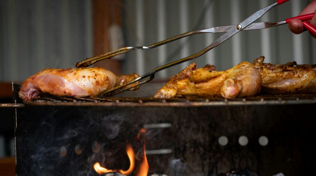 Vaše uhlí by v tomto bodě neměly být planoucí. Vyzvedněte si kuřecí kuře (nebo to sami) – to umožňuje masu rovnoměrněji vařit. Zvyšuje také povrchovou plochu pro tuto chutnou marinádu (viz recept níže)