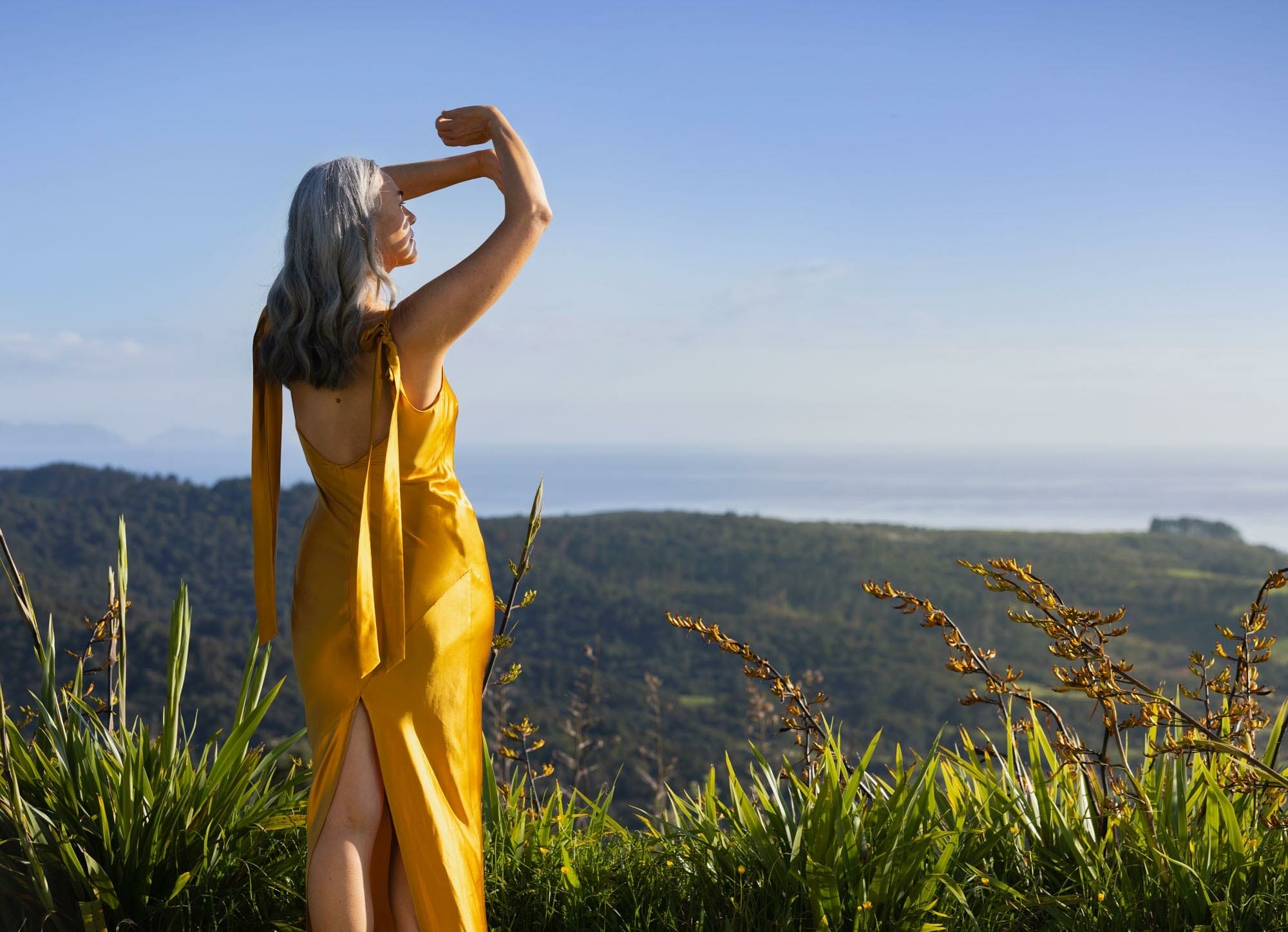 Tunika Moismont v Kim Firefly od Madder & Rouge, 259 dolarů; Sugar Sliders in Buoyant Orange od Allbirds, 80 dolarů.