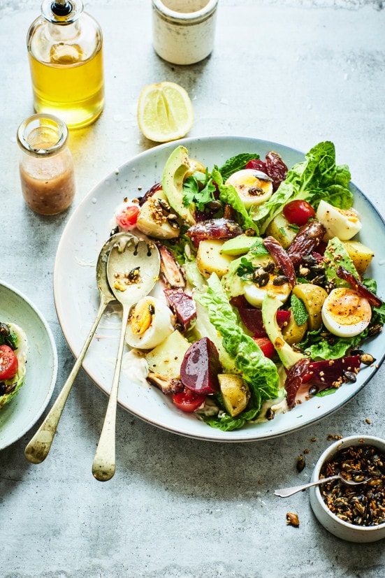 - Sestavení: Jogurt krátce prošlehejte s melasou z granátového jablka a nandejte na servírovací talíř, rozetřete zhruba po základně. Listy hlávkového salátu smíchejte s polovinou vinaigrette dresinku a rozsypte je na jogurt. Navrstvěte zbytek ingrediencí – vejce, brambory, řepu, datle a plátky avokáda – rozetřete na natrhané bylinky a polovinu opečených semínek.
