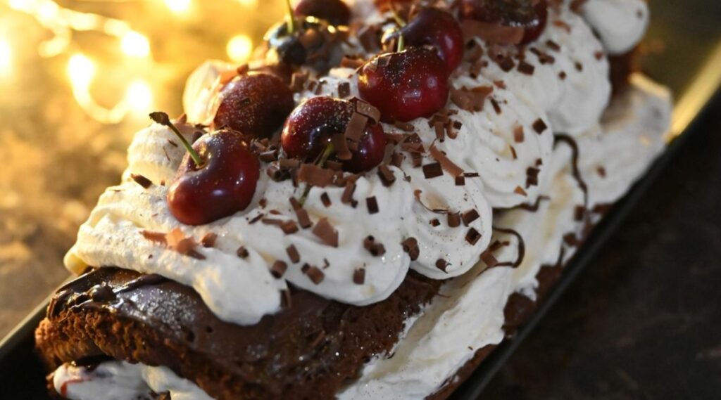 - Jemně rozbalte dort, papír vyhoďte. Dort potřete štědrým množstvím Nutelly, pokapejte lehce rozpuštěným džemem (pro snadnější roztírání) a tenkou vrstvou šlehačky. Znovu svineme a poprášíme moučkovým cukrem. Ozdobte zbytkem šlehačky, hoblinkami čokolády a višněmi.