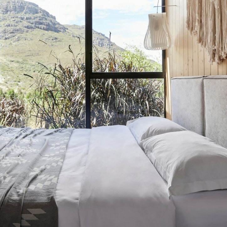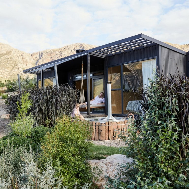 Svěží kabina v odlehlém údolí Breede v Jižní Africe kombinuje dramatické výhledy s zkrácenými interiéry v nedotčené krajině.