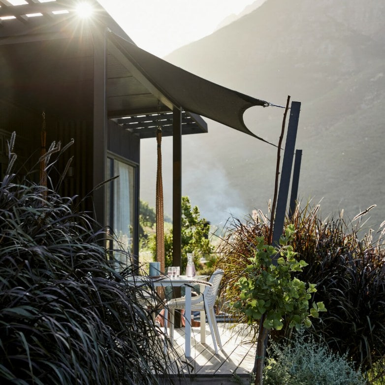 Pergola, ke které se plachta připojuje, tvoří součást konstrukce kabiny a byla přidána, aby narušila hranatý dojem modulární stavby, říká Dean. Místo toho, aby pergola nechala terasu nezastřešenou, dává jí také pocit kontextu jako venkovní místnosti. „Dává to pocit stálosti, ale stále se můžete dívat nahoru a vidět oblohu,“ říká Kim.