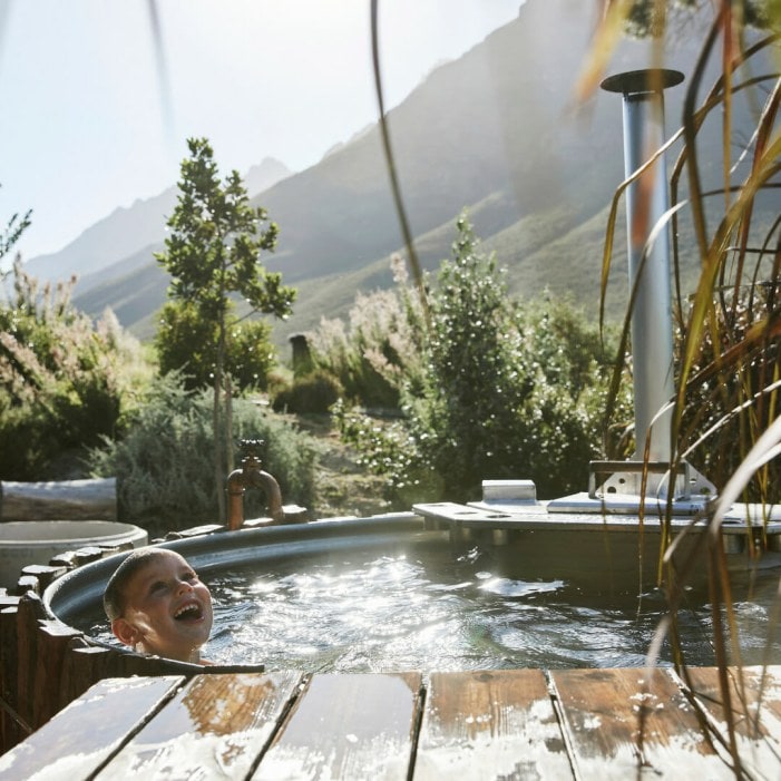 Sprchování je samozřejmě volitelné, pokud je k dispozici kruhový bazén vyhřívaný spirálami, který lze v noci vyhřívat ohněm. Obložený surovým dřevem je pohlcen svým okolím a sedí na úrovni paluby, takže výhled je ničím neomezený. „Všechno, co jsme dělali interně i externě, jsme si mysleli, že do toho vkládáme, jak to přispěje k opětovnému vtažení prostředí do vesmíru,“ říká Kim.