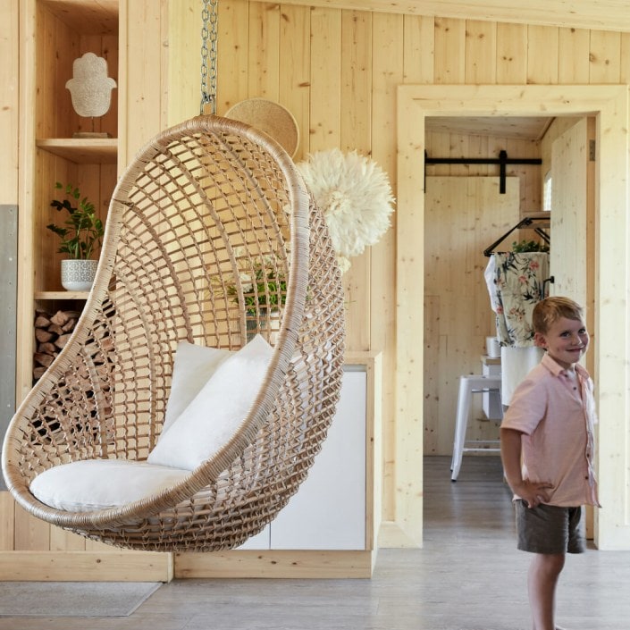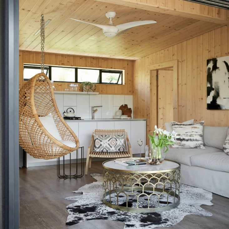 Řešením bylo poskytnout všestranné konfigurace sedadel. Lehké židle lze snadno přemístit ke kuchyňským rozhovorům nebo blíže ke krbu pro útulnou noční čepici. Hrdinou prostoru je závěsné křeslo, které vytváří ‚zvláštní místo‘ a bylo instalováno tak, aby měl specifický výhled dolů do údolí. „Může vám to umožnit cítit se uzavřený a soukromý. Ale můžete se také zhoupnout jedním způsobem, jak si užít výhled, a vrátit se zpět a zúčastnit se kuchyňského klábosení,“ říká Kim.