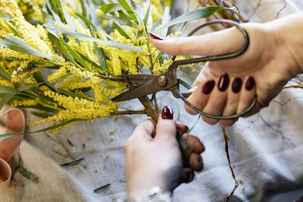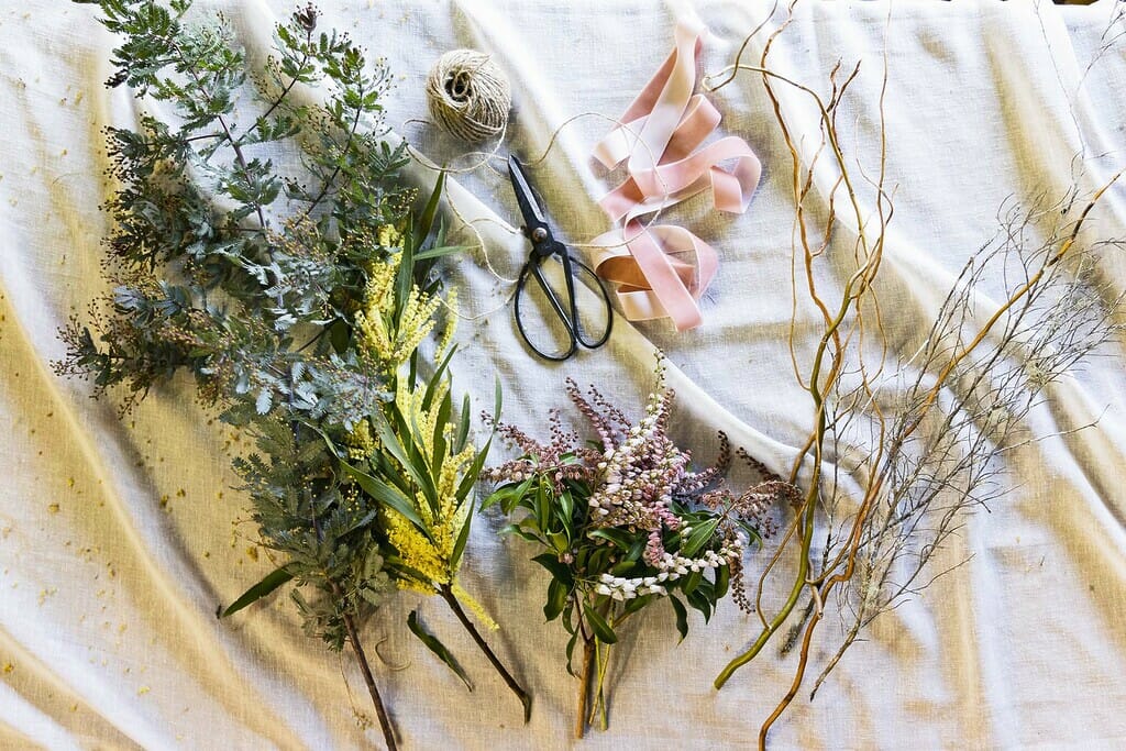 Věnce nejsou jen vánoční. Jsou krásným způsobem, jak oslavit měnící se roční období a milníky, jako je začátek přechodu na letní čas, a využít vše, co vám vaše zahrada daruje. Na tento jsem použila stonky kroucené vrby (ale poslouží jakékoli silné, pružné stonky), dva druhy akácie a Pieris ‚Temple Bells‘.