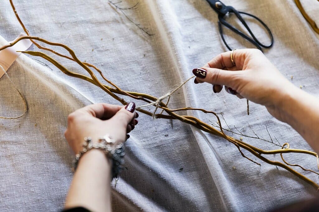 Začněte stočením jednotlivých stonků vrby k sobě, poté je začněte postupně tvarovat do velkého kruhu. Nevhodné prameny svažte provázkem, mezi stonky udržujte dostatečnou mezeru, abyste mezi ně mohli při zdobení věnce snadno vložit květiny – měli byste se zaměřit na pevné, ale volné hnízdo. Konce stočte k sobě nebo je svažte provázkem.