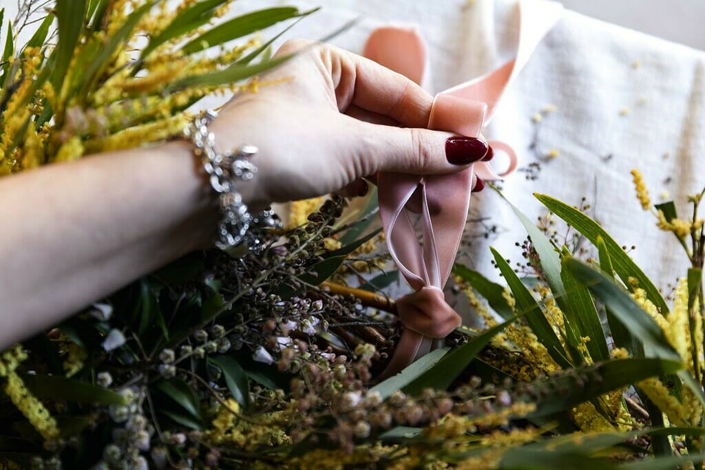 Jakmile budete se svou kompozicí spokojeni (a kdo by nebyl – výroba věnce je tak zábavná a super snadná), přivažte v případě potřeby volnou zeleň k základu věnce provázkem. Vypracujte, kde chcete mít horní část věnce, a svažte jej stuhou. Zavěste si věnec kamkoli chcete – dveře, zeď, bránu nebo krb – a přivítejte jaro.